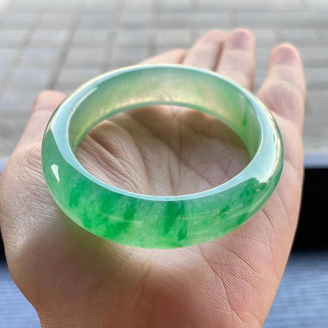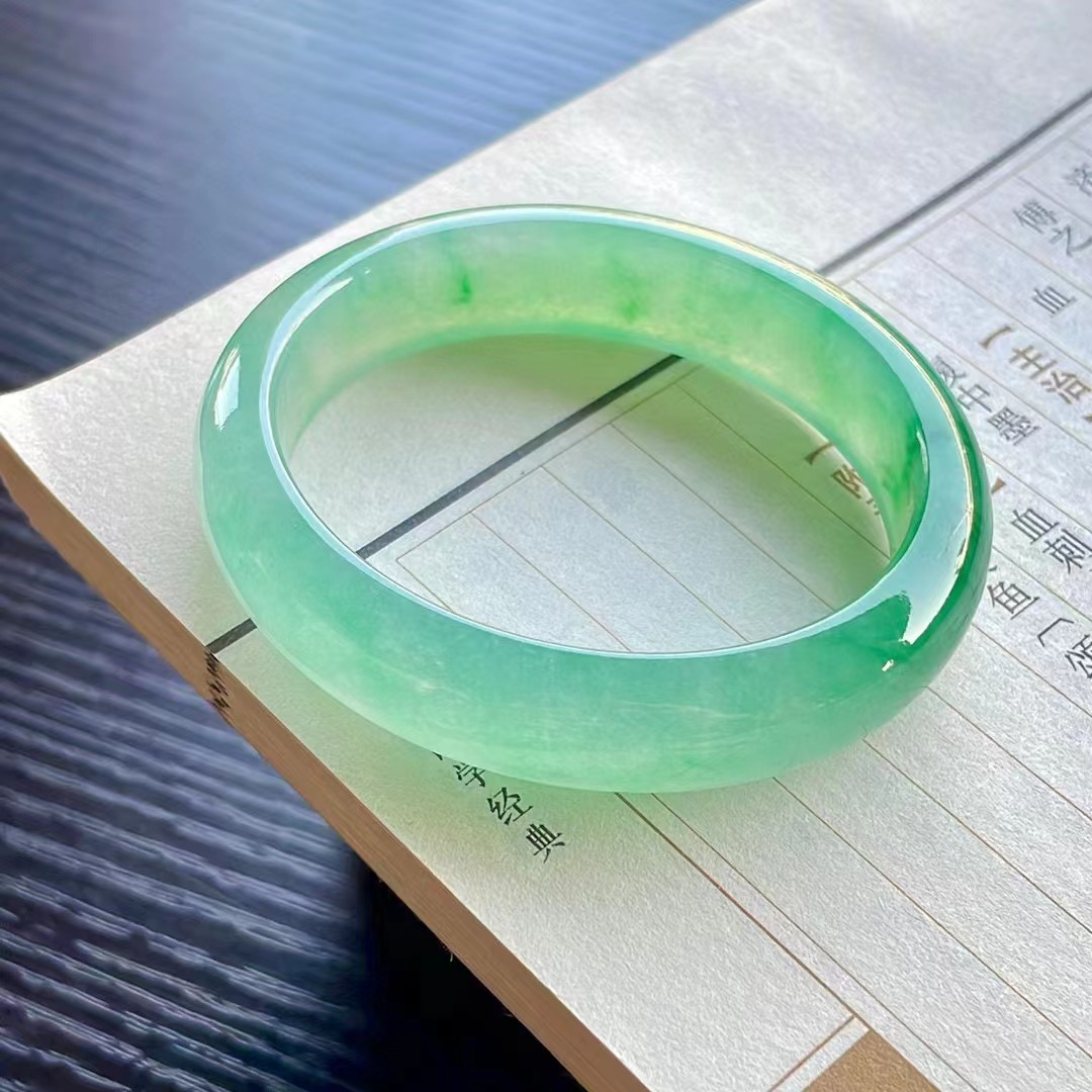 【描述】冰種晴綠飄綠花手鐲,晶瑩剔透、種老、水潤,無紋裂